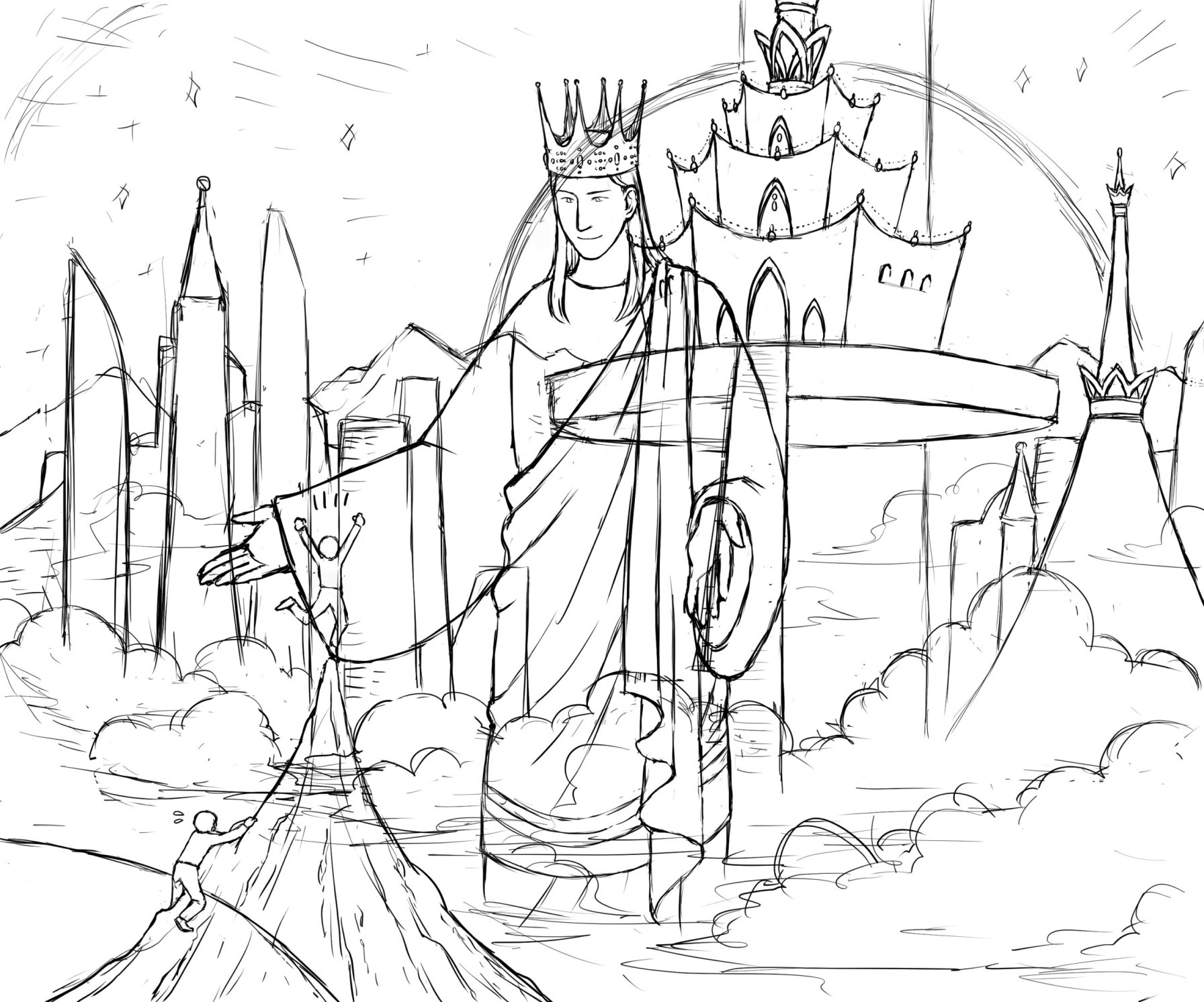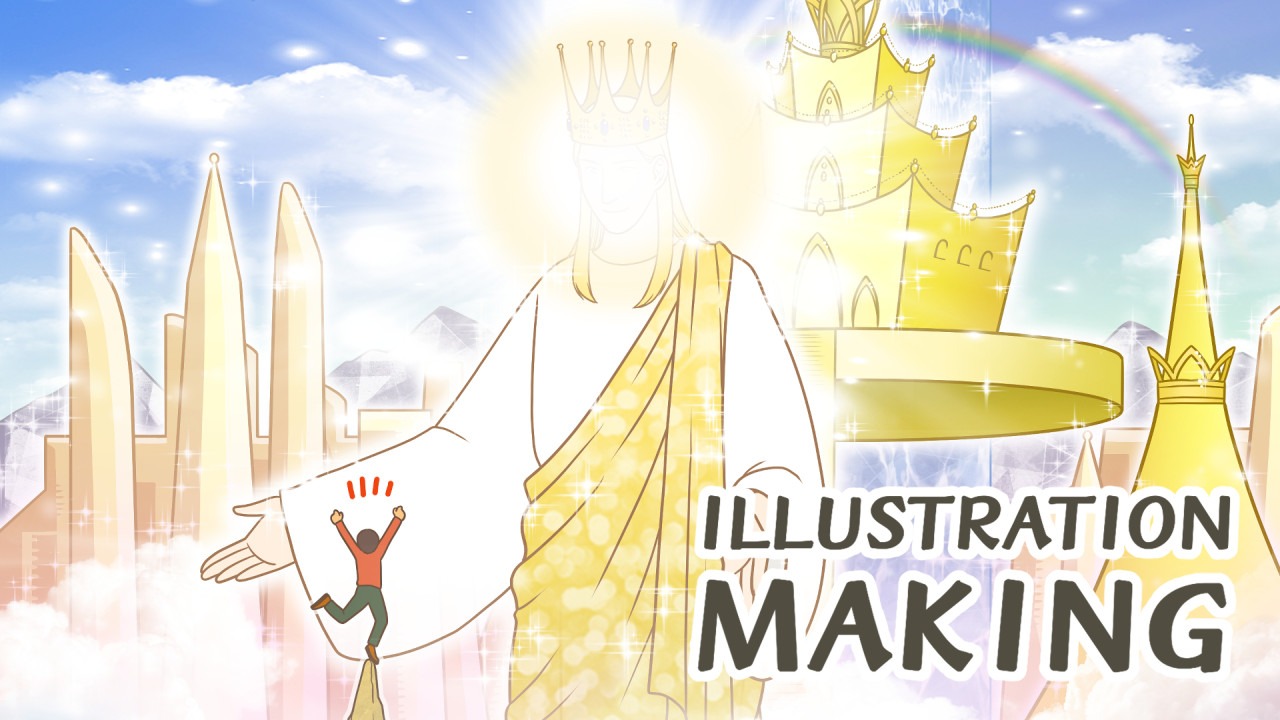 「永遠」というものすごいもの(← 語彙力)を表現したかったですが、絵という2次元平面の有限な空間の中では表現しようがなかったので、試行錯誤の末、「天国の広がりと壮大さ」と「地上の困難」の対比を強調するような構図にしました。