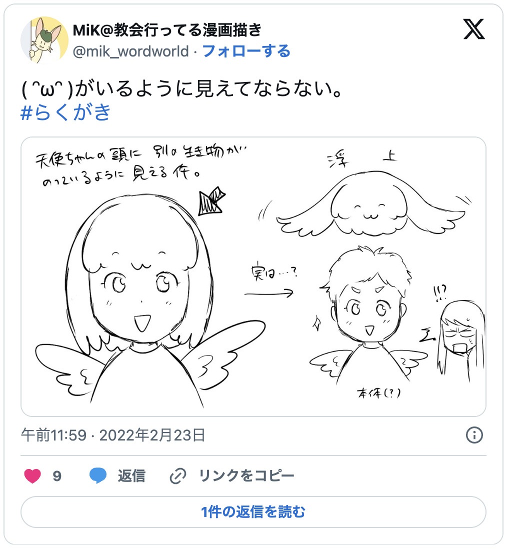 このキャラ、前回LINEスタンプを作った時に天使ちゃんを描きまくった結果、天使ちゃんの頭に別の生き物が乗っているように見えてきて生まれたキャラクターです😂笑笑