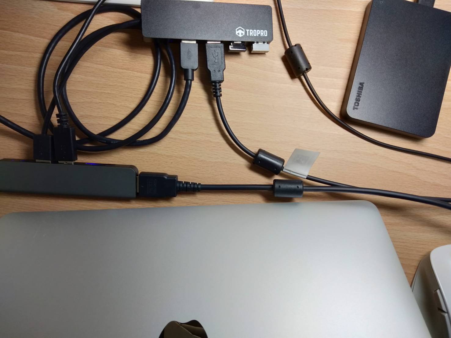 もともとバックアップ2個に加えて液晶タブレットとその左手デバイスとマウス(無線)も繋いでたので、さらにハブが増えてコード類がすごいことに。