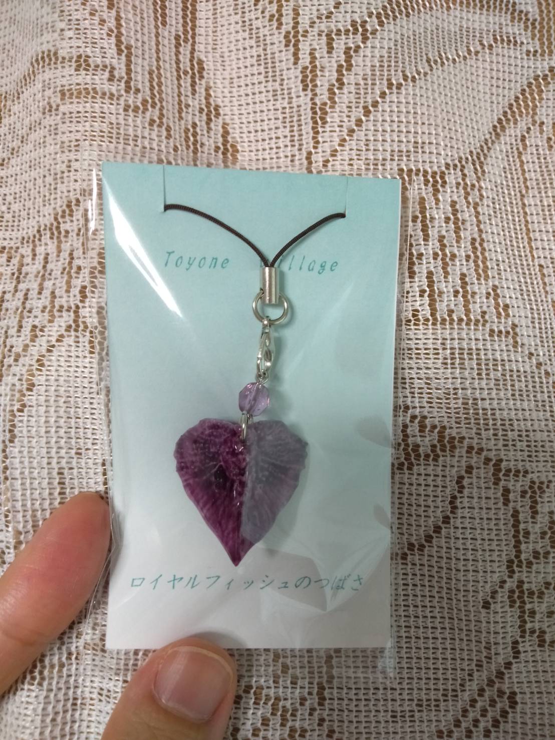 チョウザメ(ロイヤルフィッシュ)の鱗を使ったストラップだそうです。他にも様々な形や色があり、メンバー3人でガサガサ漁って各々気に入ったストラップを頂きました。村の人たちみんなめっちゃいい人…。