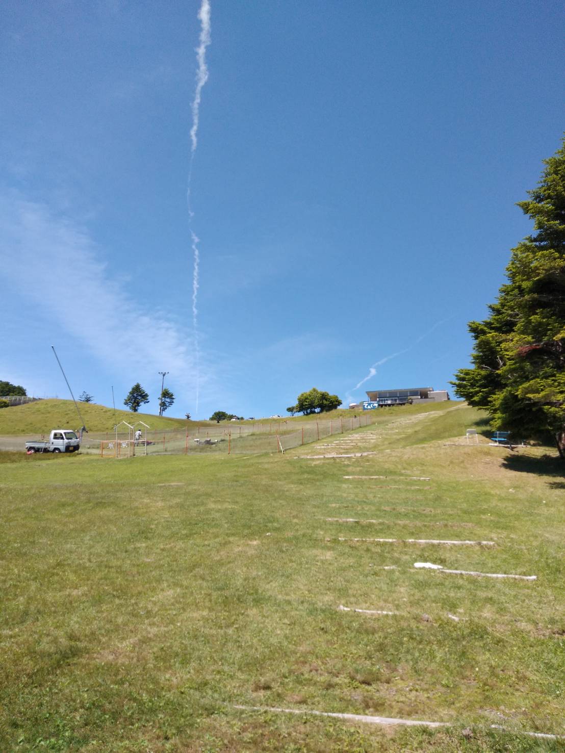 ご飯を食べて、賛美をして、私は水辺の生き物を探し(オタマジャクシ、小魚、サワガニがいました)、ゆっくり過ごしてから、車で茶臼山に向かいました。くねくねした山道を進んでいくと牧場があり、駐車場がありました。