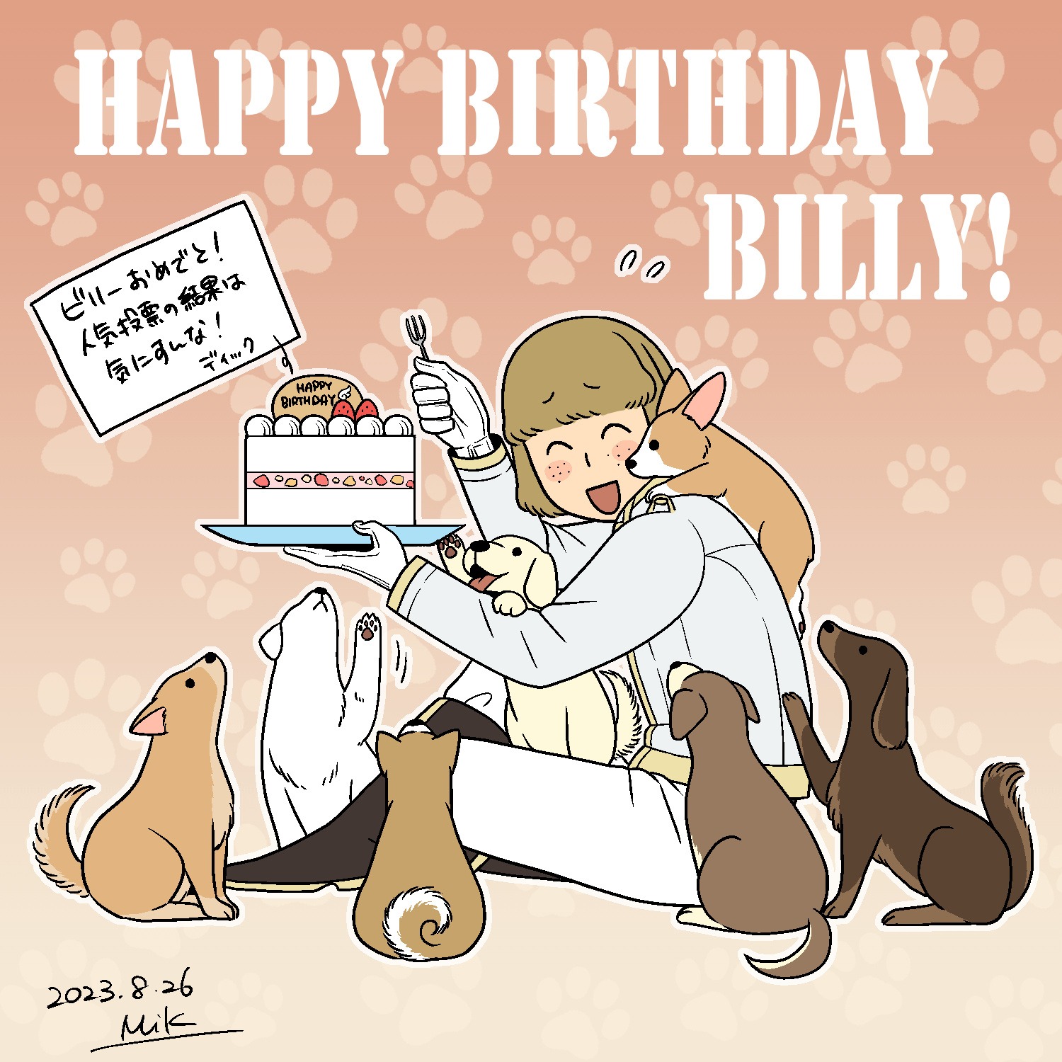 ビリーくんにはビターチョコのケーキにしたかったんだけど(好きそう)、犬がチョコ食べたらまずいので普通のショートケーキにしました。彼の誕生日の直前にキャラ人気投票やったんですが、結果が散々だったのでディックが慰めてくれてます。
