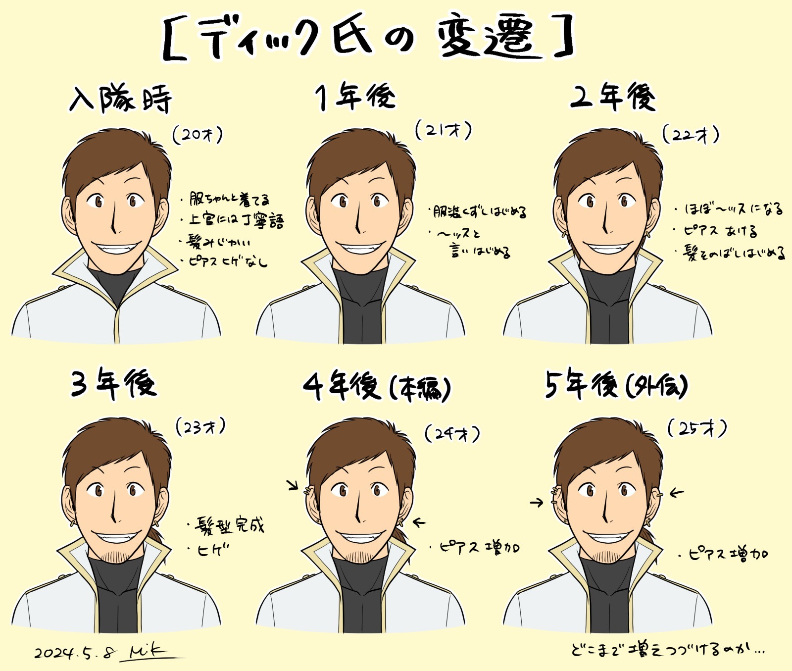 入隊後3年でほぼ現在のディック氏ができあがりました。ここ最近はピアスが増え続けています。ビビリだけどオシャレのためにピアスは頑張ってるんだと思う。