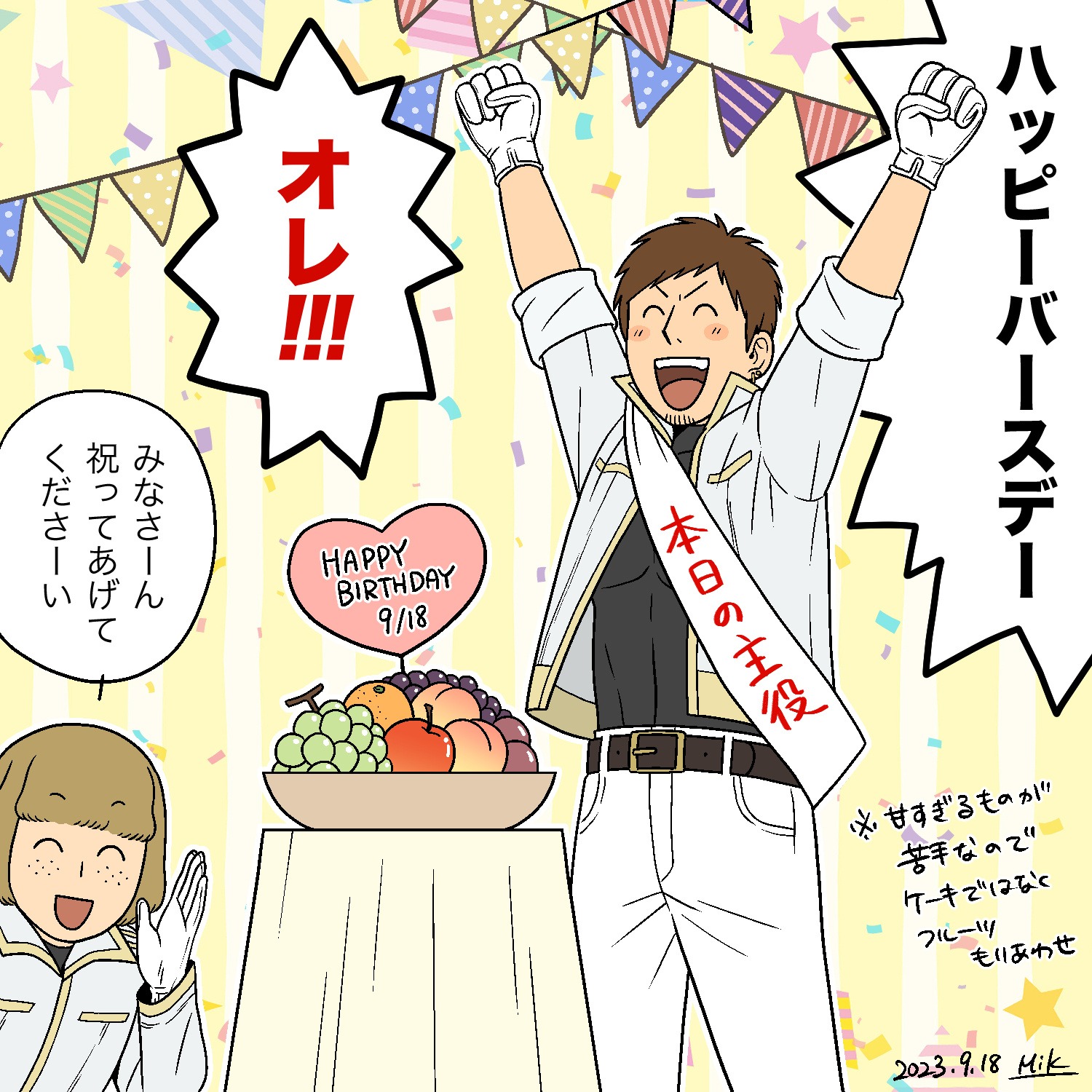 「祝ってくれる人がいないから自分で祝っててかわいそう」って言われたけどそういう絵ではないです!!「ぜひともオレを祝ってくれ!」というアピールの絵です。