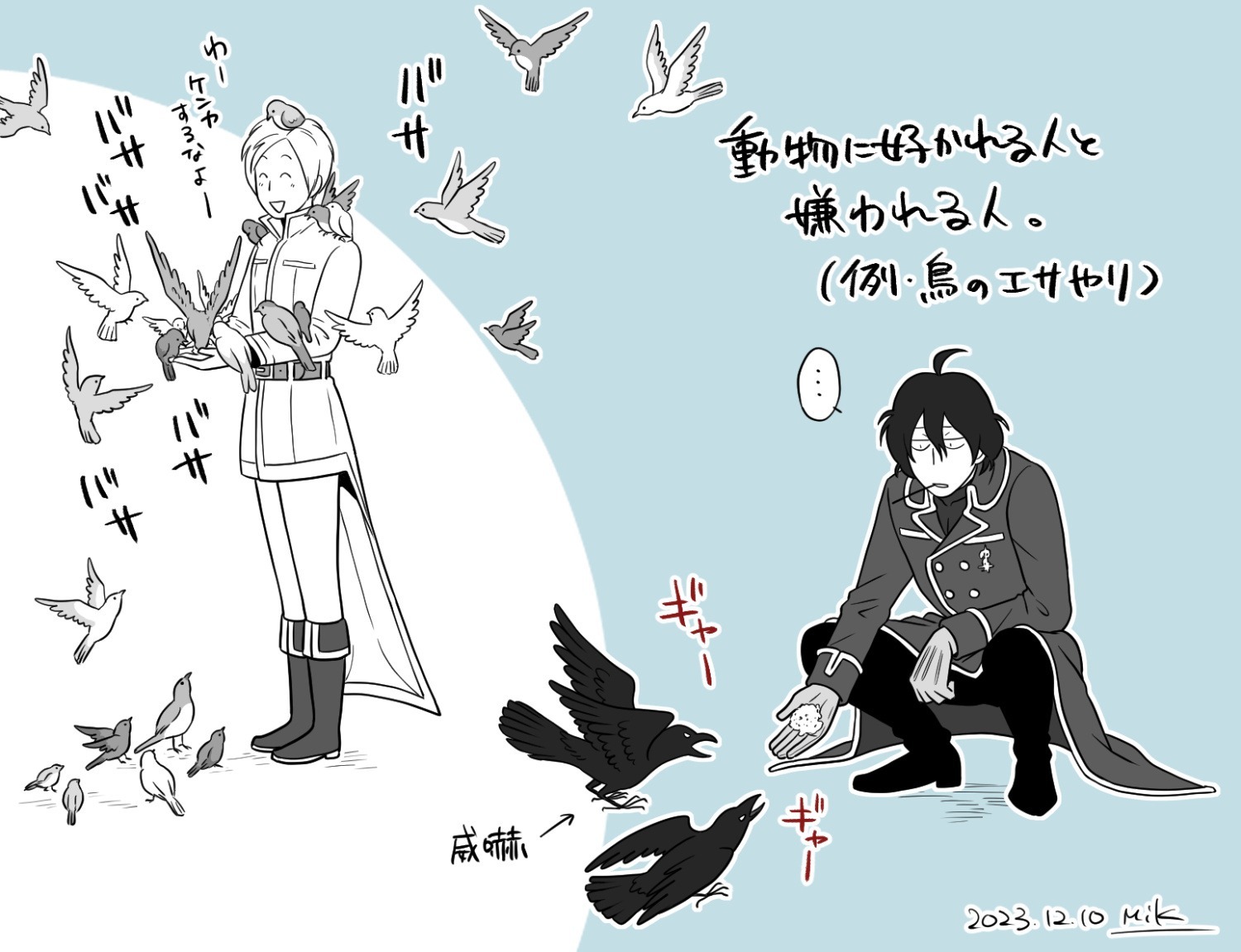 本編描いてた頃に描きたかったけど余裕なくてタイミングを逃したらくがき。マグラさんはそもそも動物に嫌われるので小鳥は寄り付かず、仕方なくその辺にいたカラスにエサやろうとしたけど威嚇されたの図。