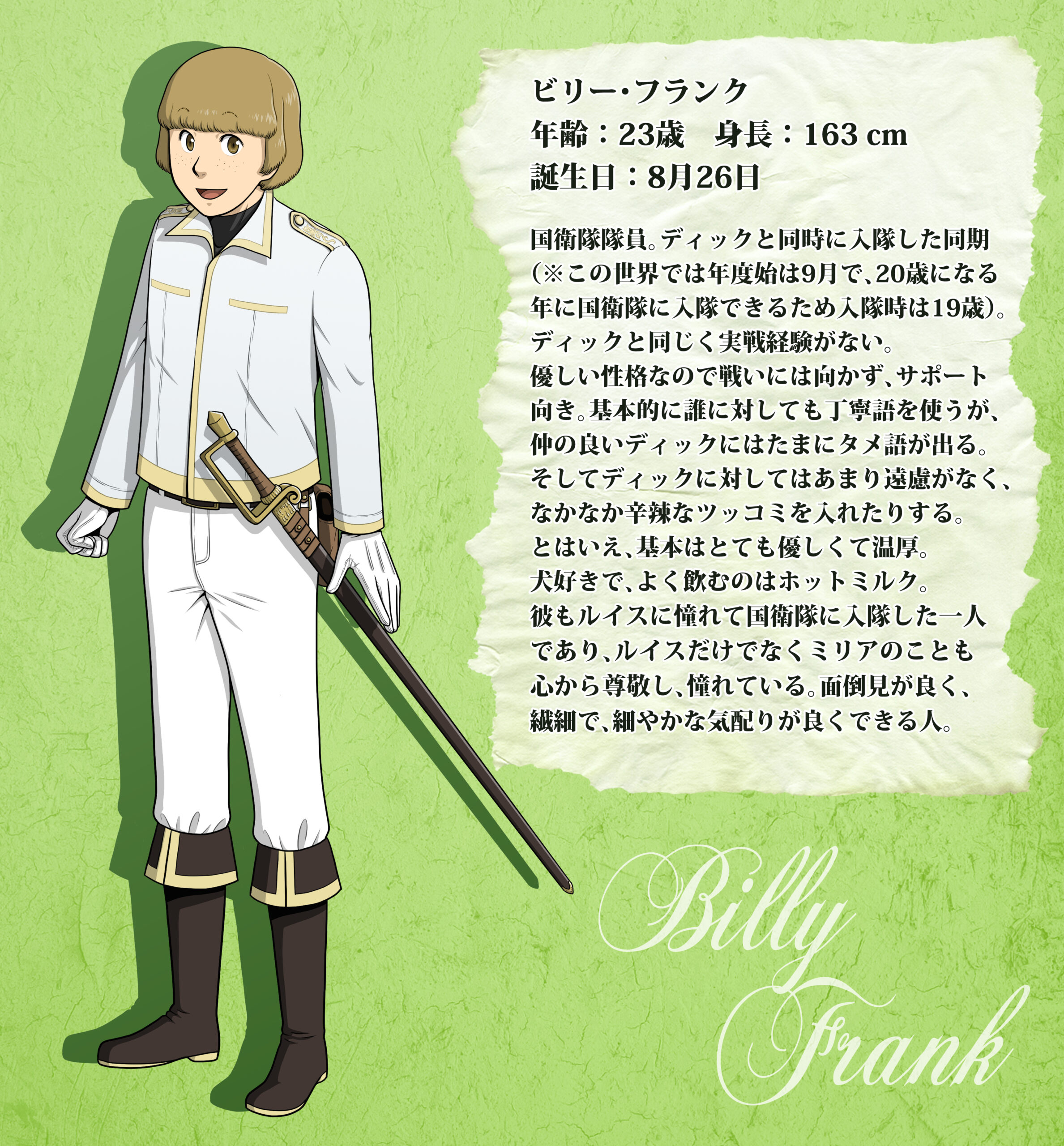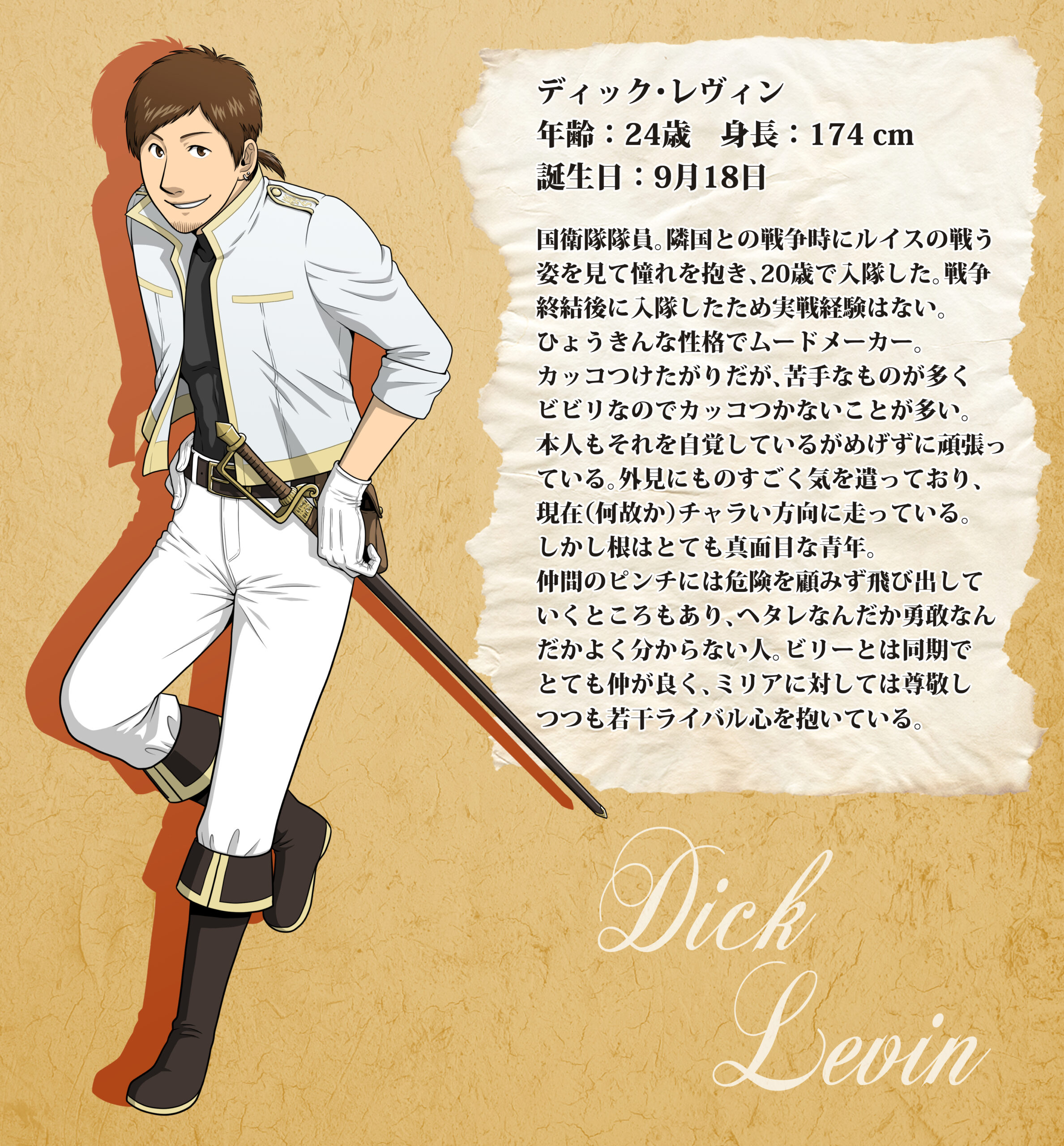 目立とうとして頑張るけど派手に失敗して不名誉な目立ち方ばかりしてしまう残念な人です。本編はルイスとミリアがメインなので彼の残念なシーンはあまり出てきません。らくがきをご覧ください。