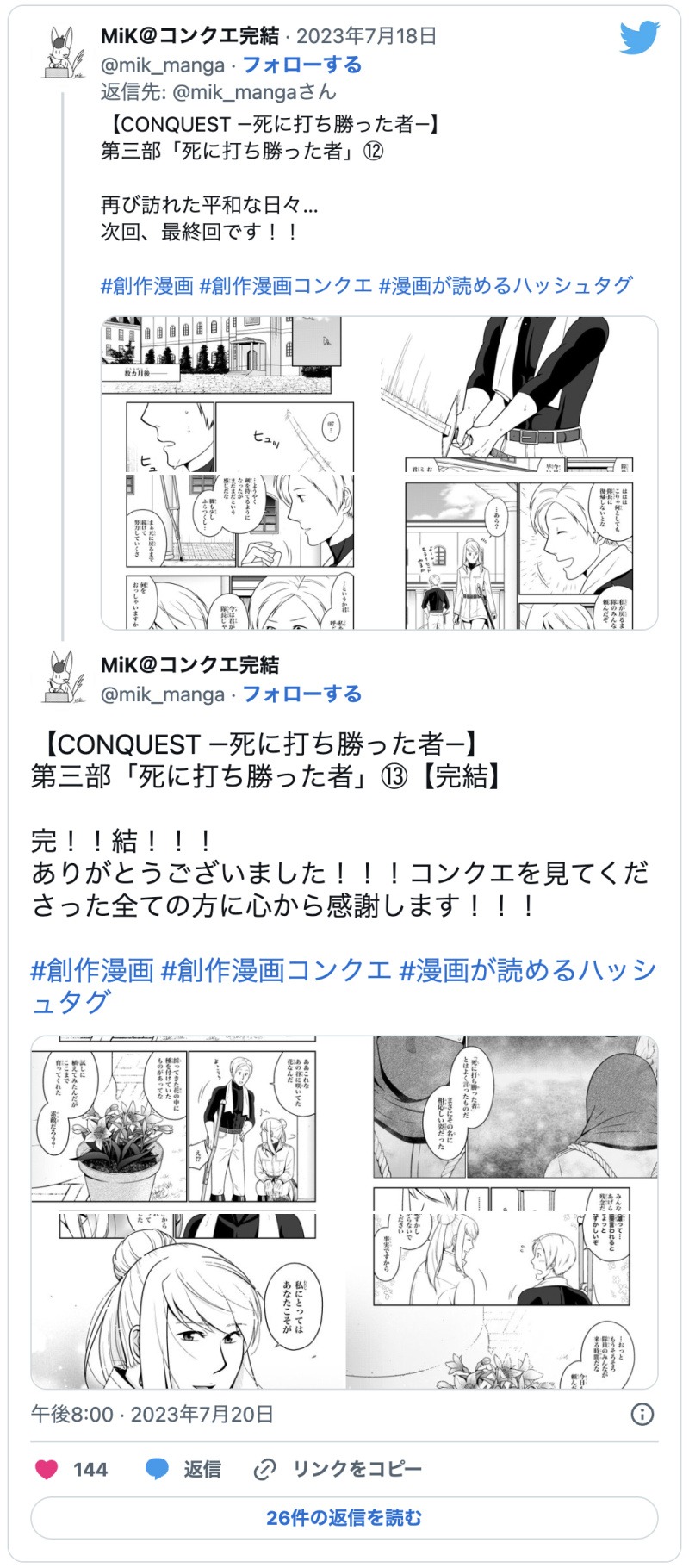 Twitterで最終回をあげたところ、本当にたくさんの反応をいただけて、感想もたくさんいただけて本当に嬉しかったです(感想は全てスクショ撮ったりして保存してます笑)。改めて、読んでくださって本当にありがとうございました!!✨✨