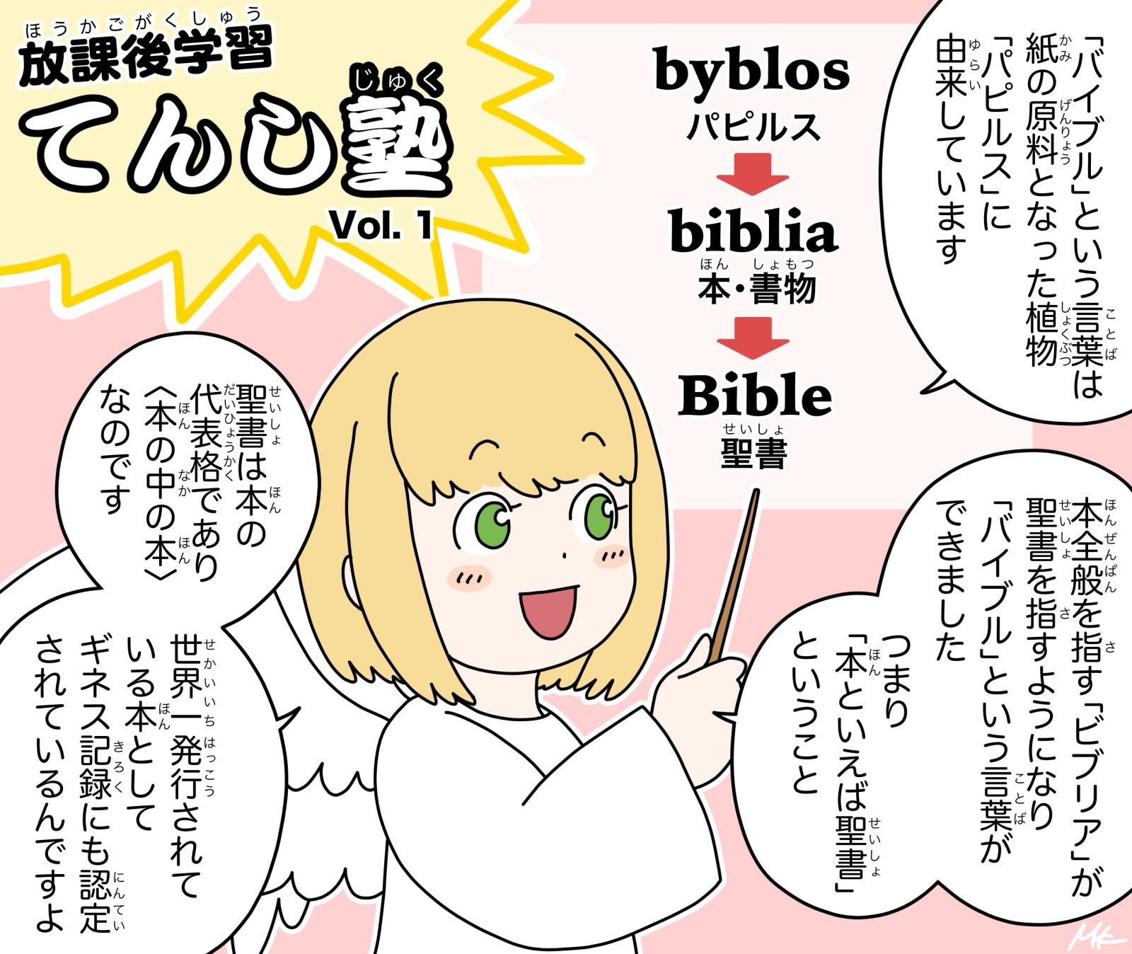 キリスト教福音宣教会の漫画家MiKによる天使ちゃん聖書学習まんがシリーズ、天使ちゃんによる「てんし塾」が開講!今回は「Bibleの語源」について教えます!