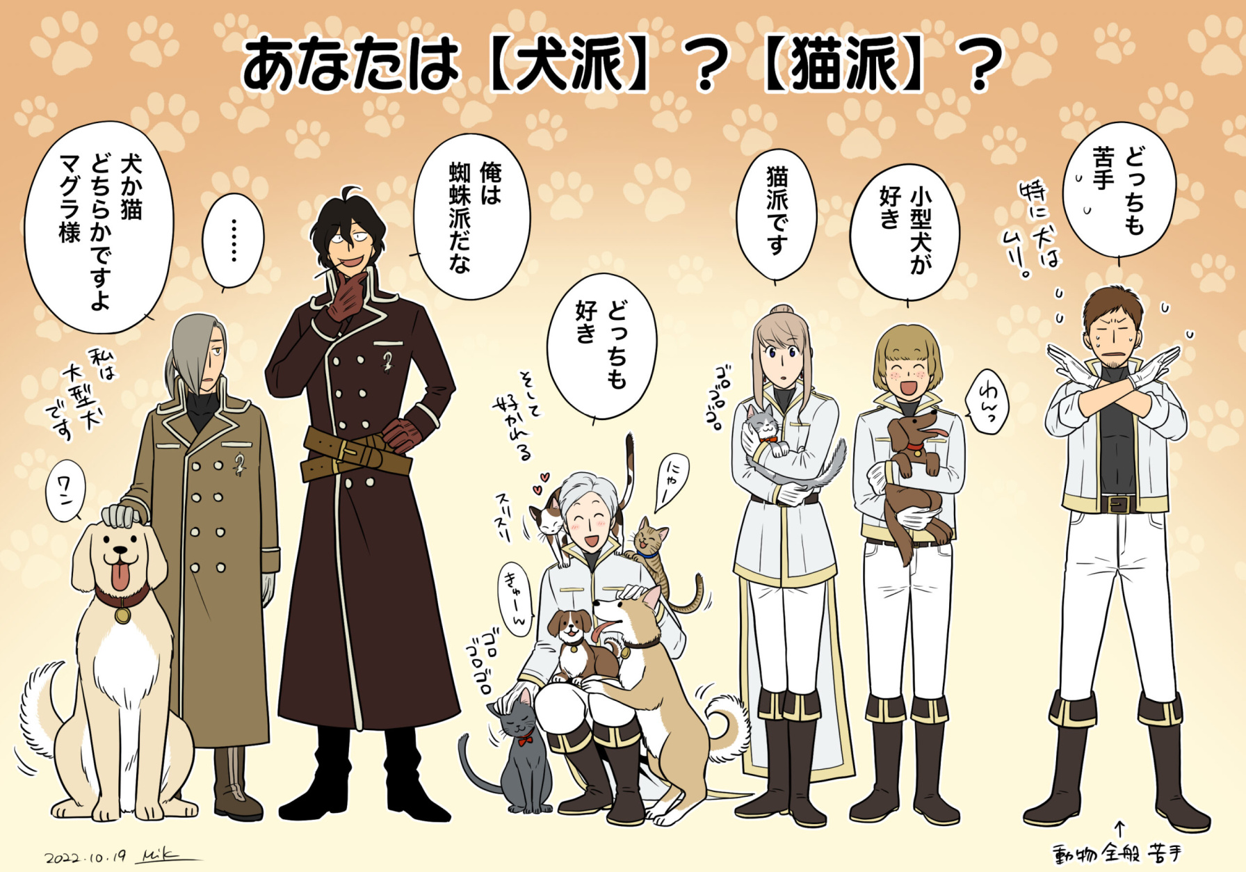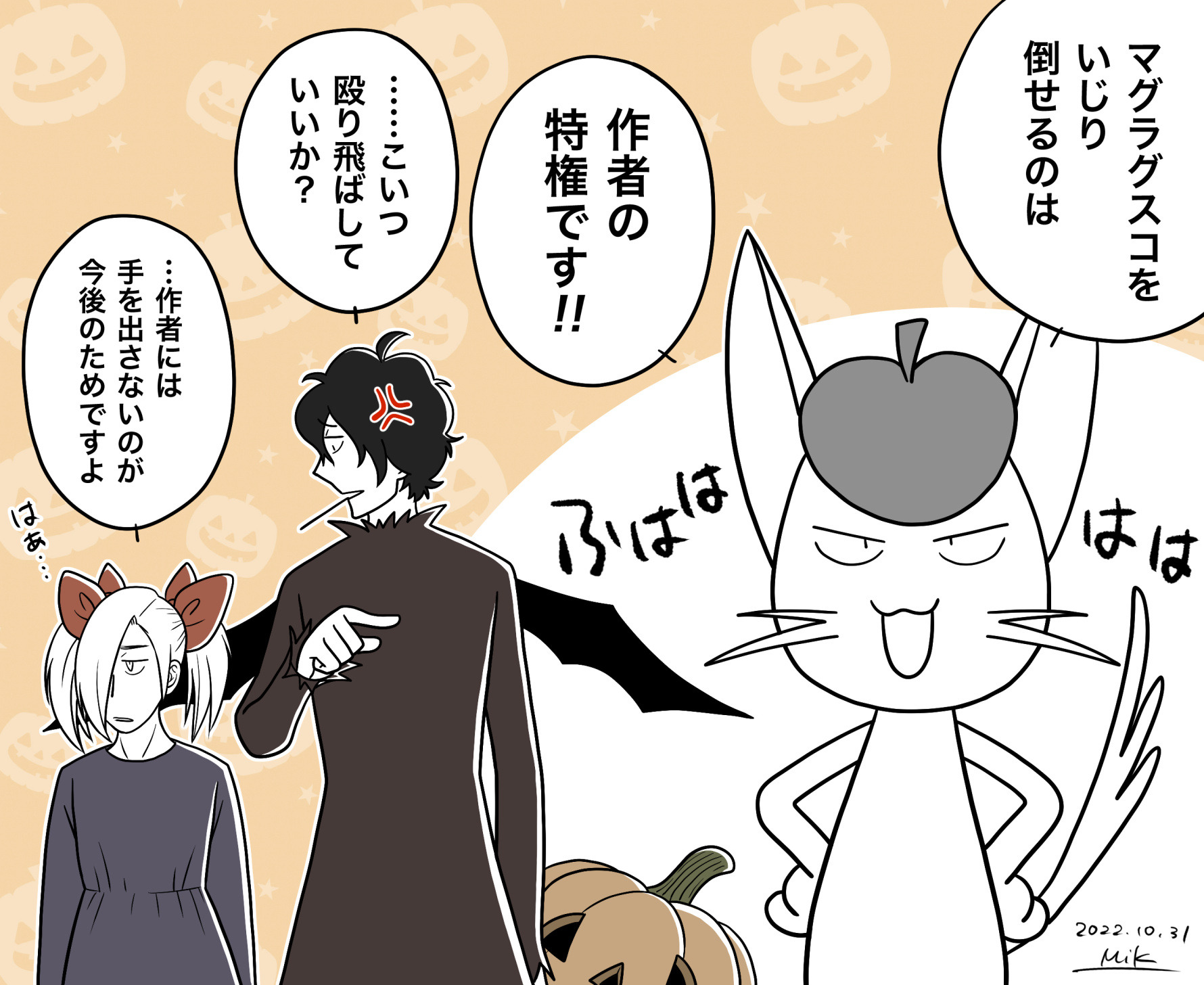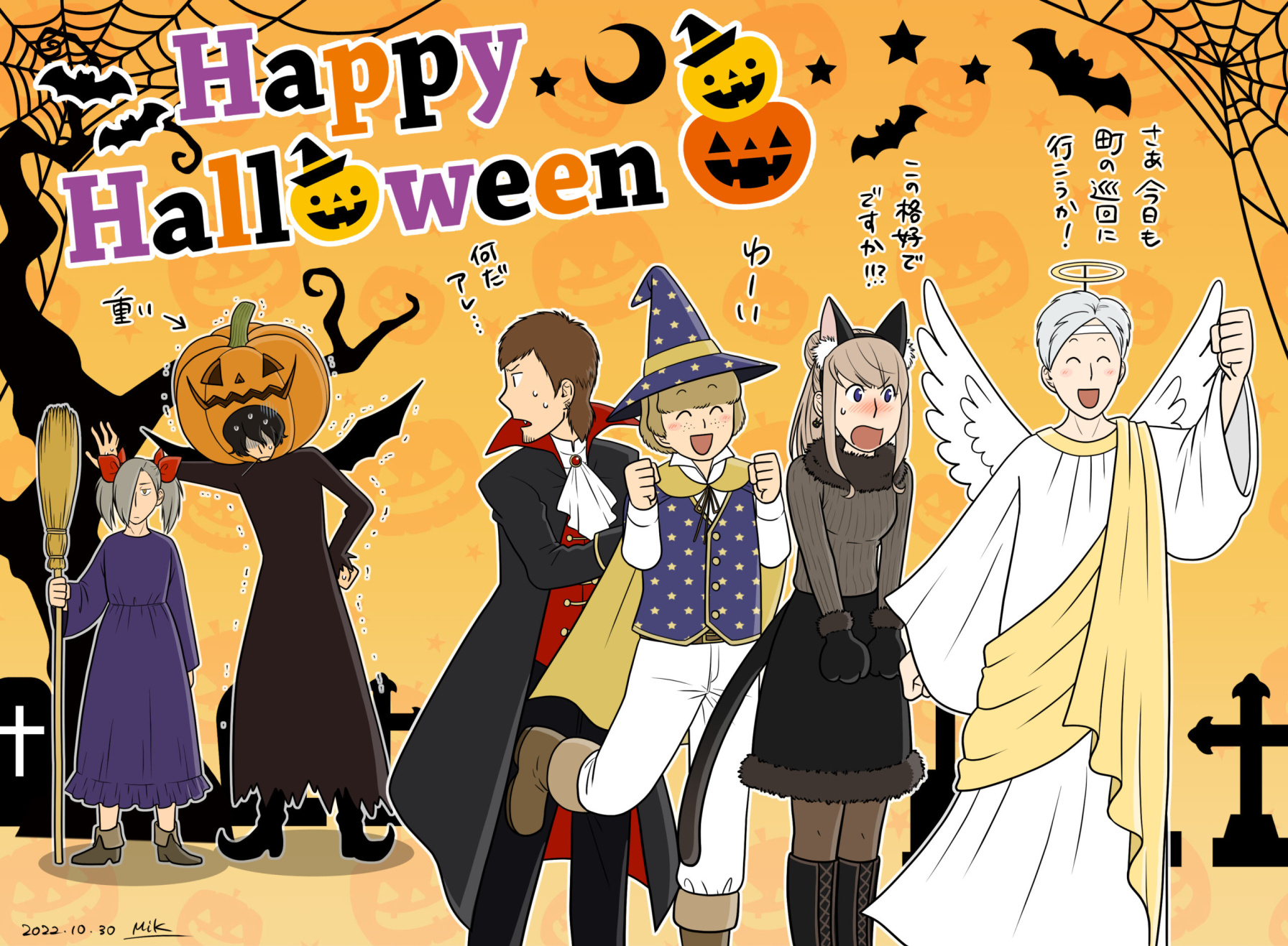 ハロウィンイラストです。マグラさんは仮装を拒否ったので作者からペナルティ食らってます。ルイスさんに黒系の服着せる気にならず、名前もミハイル(=大天使ミカエル)なので天使にしました。若干浮いてる気がしますが本人は全く気にしてません。ミリアさんはイヤリングも黒猫です。